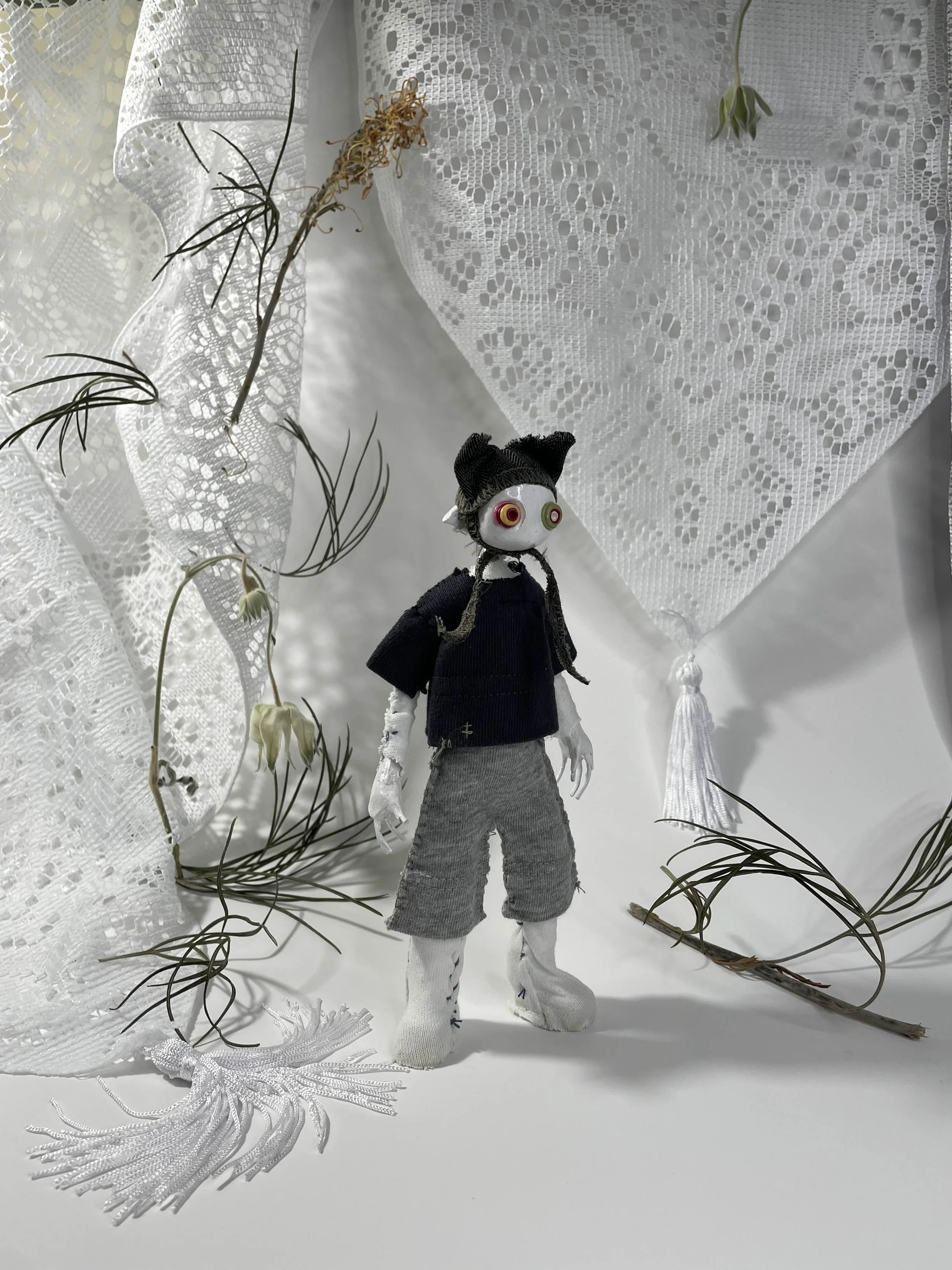 These one-of-a-kind, handcrafted dolls are full of character and charm. Each doll features a poseable body, expressive eyes, and carefully stitched clothing made from upcycled fabrics. No two are exactly alike—each is uniquely styled with intricate details, from patched shorts and handmade hats. Whether displayed on a shelf or posed in a scene, these dolls bring a bold, whimsical energy to any collection. Perfect for collectors, storytellers, or anyone drawn to the wonderfully weird.